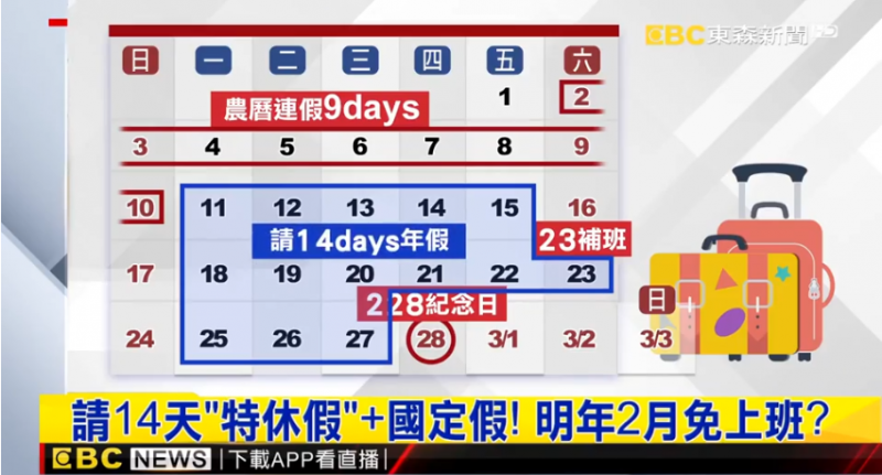 有網友在臉書社團「爆廢公社」指出,整個2月的放假日有13天,其中因二二八假期的3月1日為彈性放假,故2月23日周六需另外補班。若是已在工作崗位有3年資歷者,就可動用14天的特休假,如此一來2月只需上班1天(2月1日)就可一路放假到3月3日。